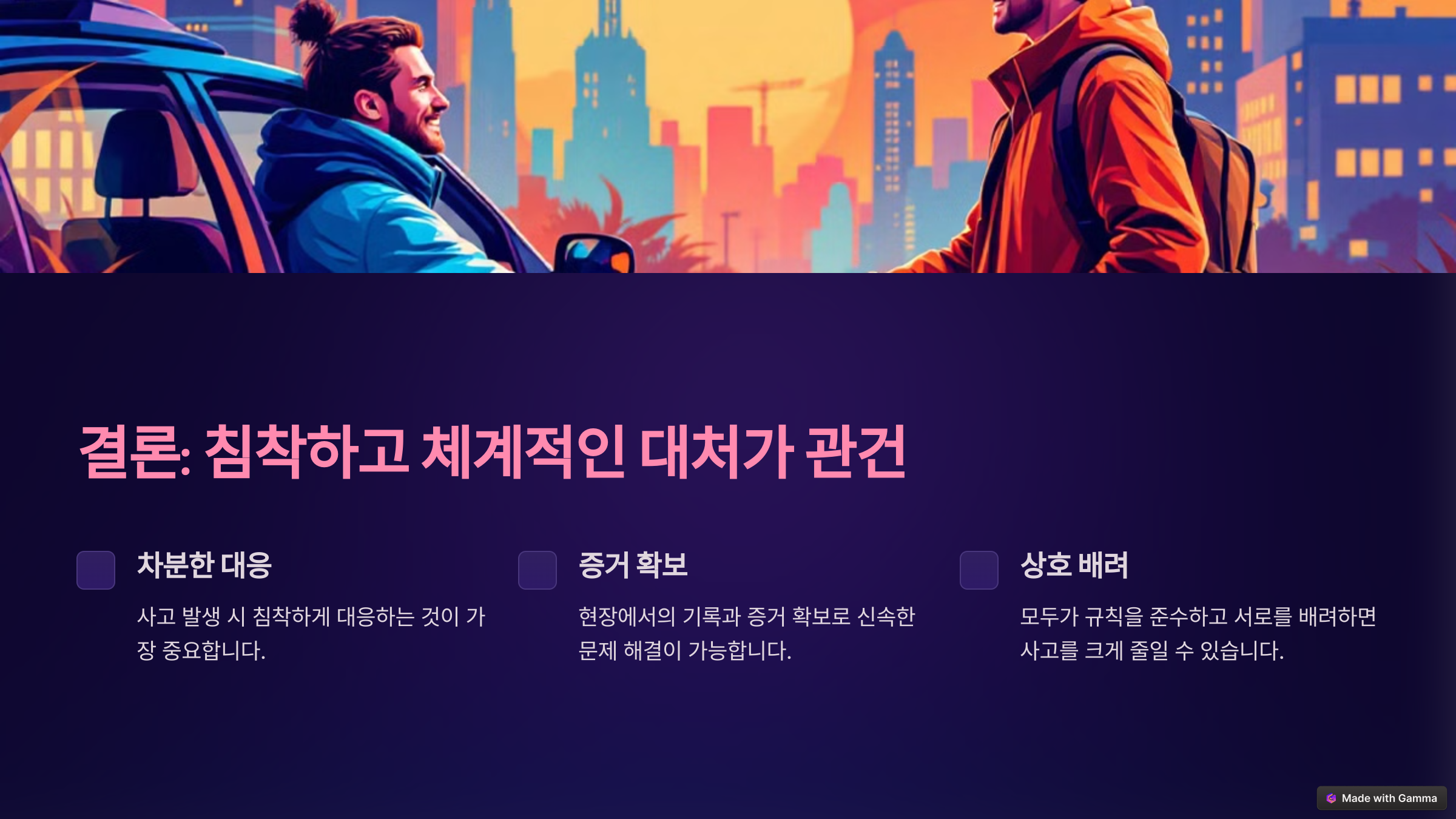 교통사고는 누구에게나 발생할 수 있는 일이지만, 사후 처리는 차분하게 대응하는 것이 가장 중요합니다. 사고 발생 시의 기록과 증거 확보, 보험사의 협조를 통해 문제를 신속하게 해결하고, 후유증 발생 가능성을 고려해 병원을 방문하세요.