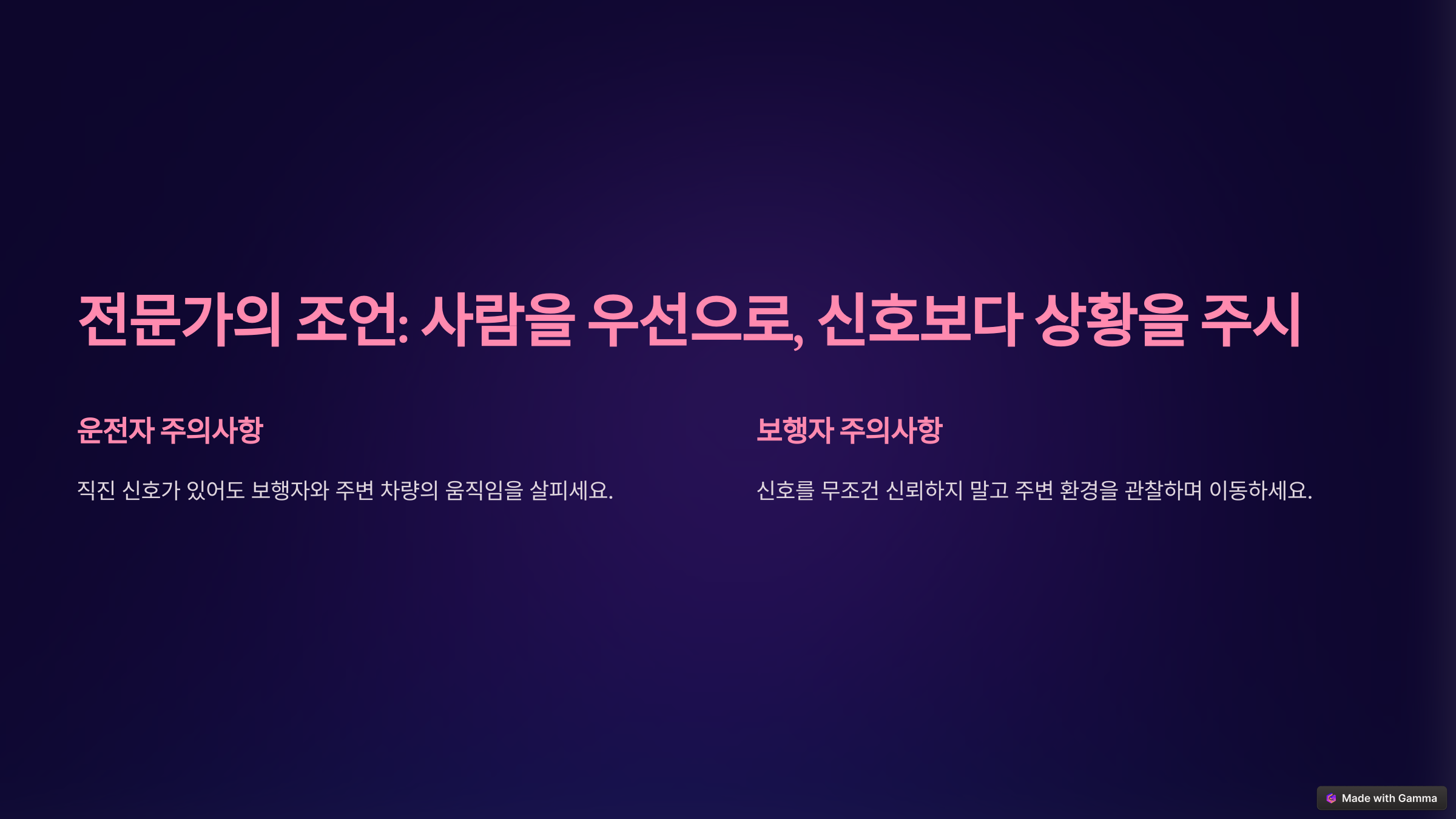 신호나 규정보다 더 중요한 것은 사람과 상황에 대한 주의입니다. 모두가 교통 규칙을 준수하면서 서로를 배려한다면, 사고의 발생을 크게 줄일 수 있습니다.