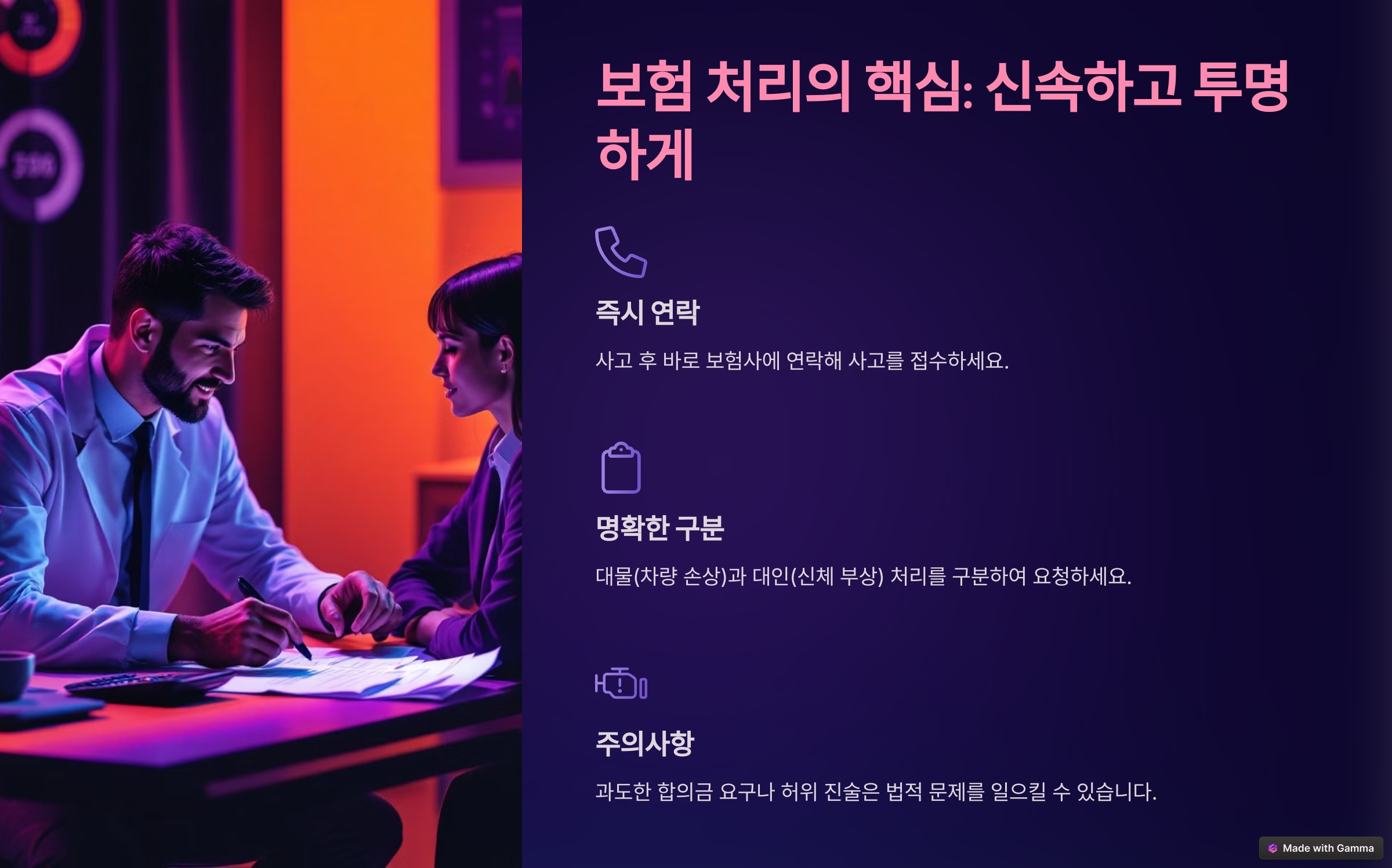 **대물(차량 손상)**과 대인(신체 부상) 처리를 명확히 구분하여 요청하세요.