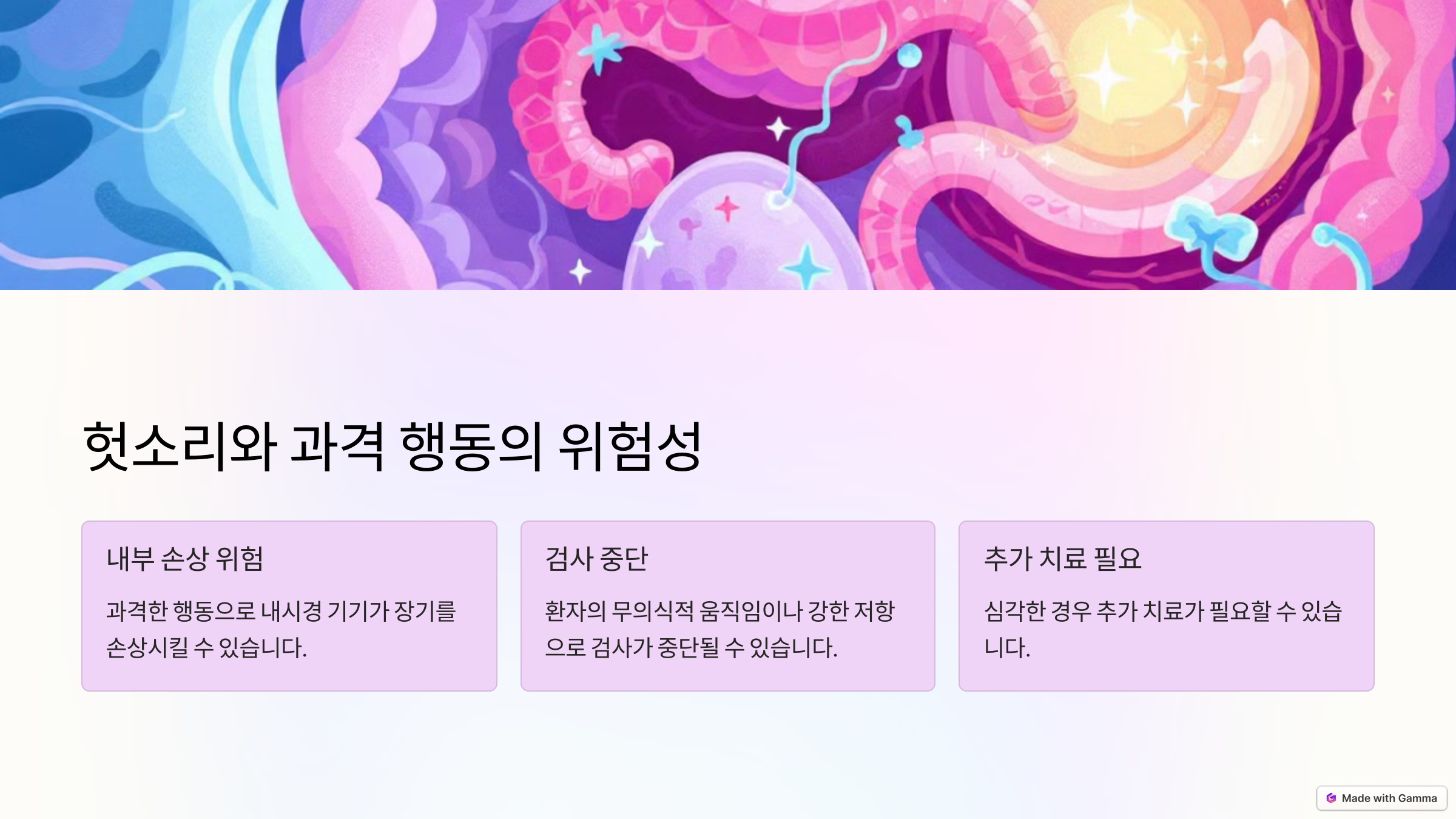 헛소리 자체는 큰 문제가 되지 않을 수 있으나, 과격한 행동은 내시경 검사 도중 심각한 부상을 초래할 수 있습니다. 예를 들어, 내시경 기기가 장기 내부를 긁거나 손상시킬 위험이 있습니다. 특히 환자가 무의식적으로 움직이거나 강한 저항을 보이는 경우, 검사 중단은 물론 추가 치료가 필요할 수 있습니다.