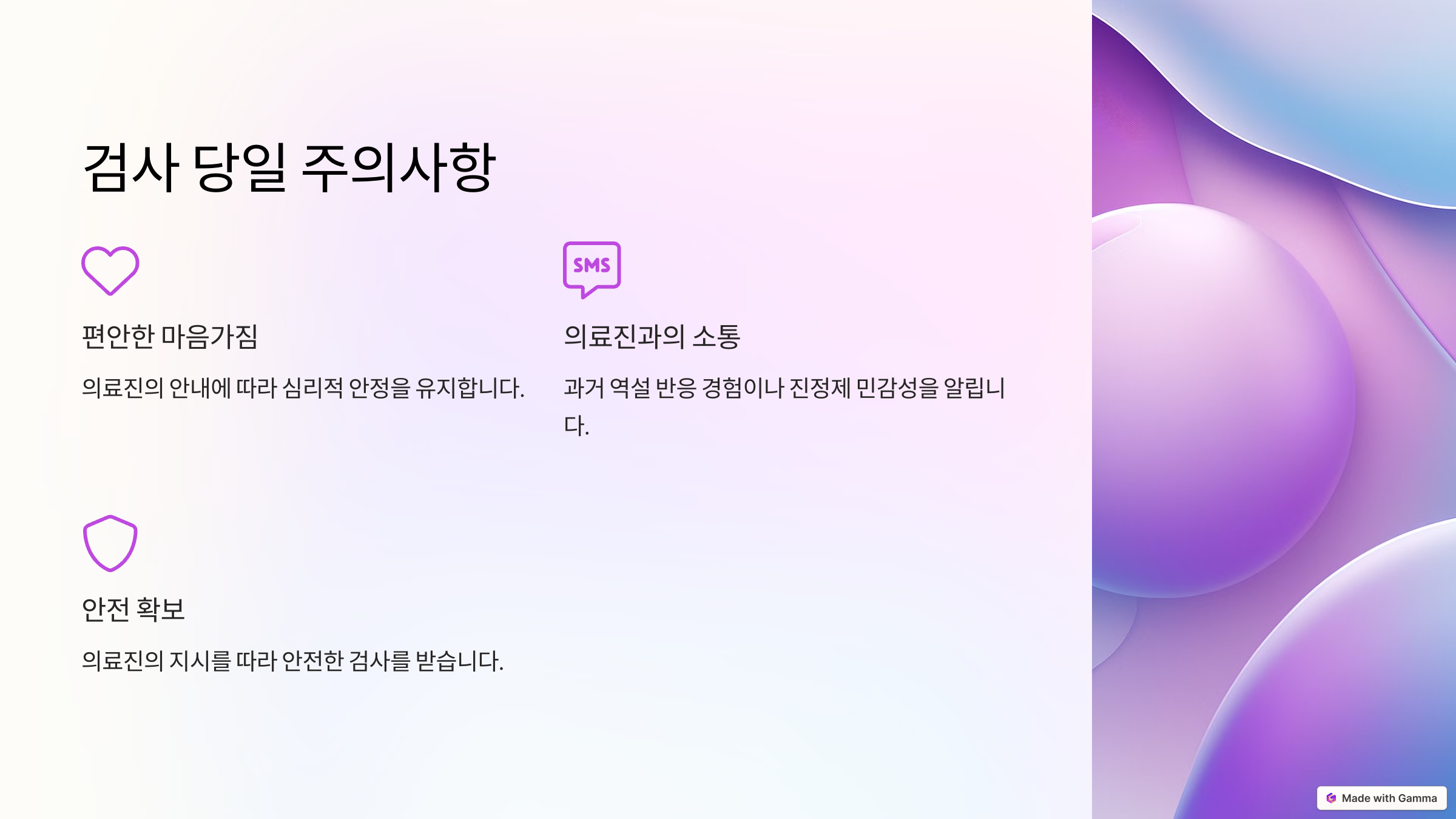 검사 전 환자가 긴장하지 않도록 의료진의 안내에 따라 심리적 안정을 유지해야 합니다.