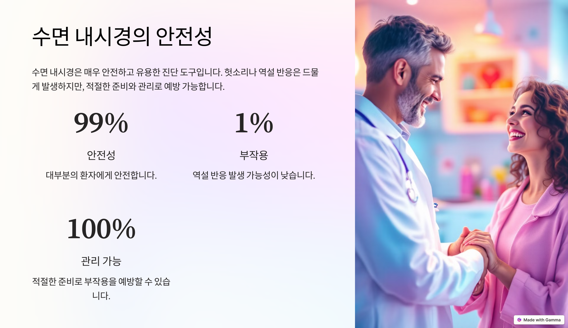 수면 내시경은 매우 유용하고 안전한 진단 도구입니다. 다만, 헛소리나 역설 반응은 드물게 발생할 수 있으며, 이를 방지하기 위해 환자와 의료진의 사전 준비가 필요합니다. 적절한 약물 용량 조절, 환자의 스트레스 관리, 과거 병력 확인 등으로 이러한 부작용을 효과적으로 예방할 수 있습니다.