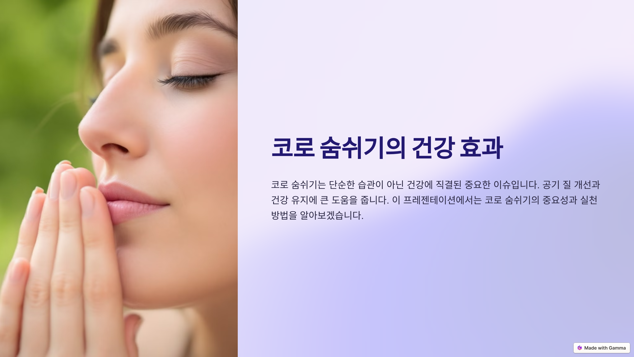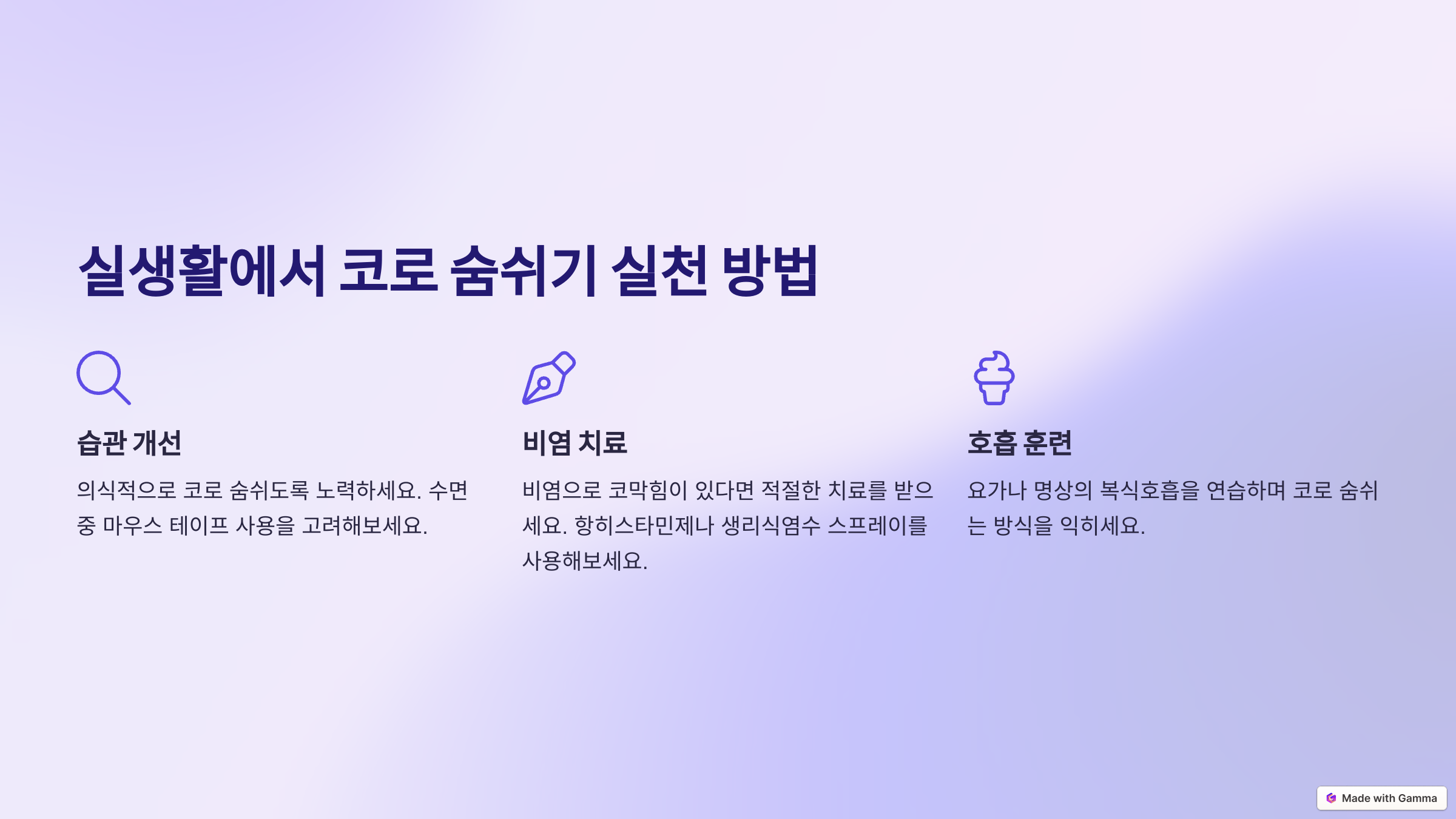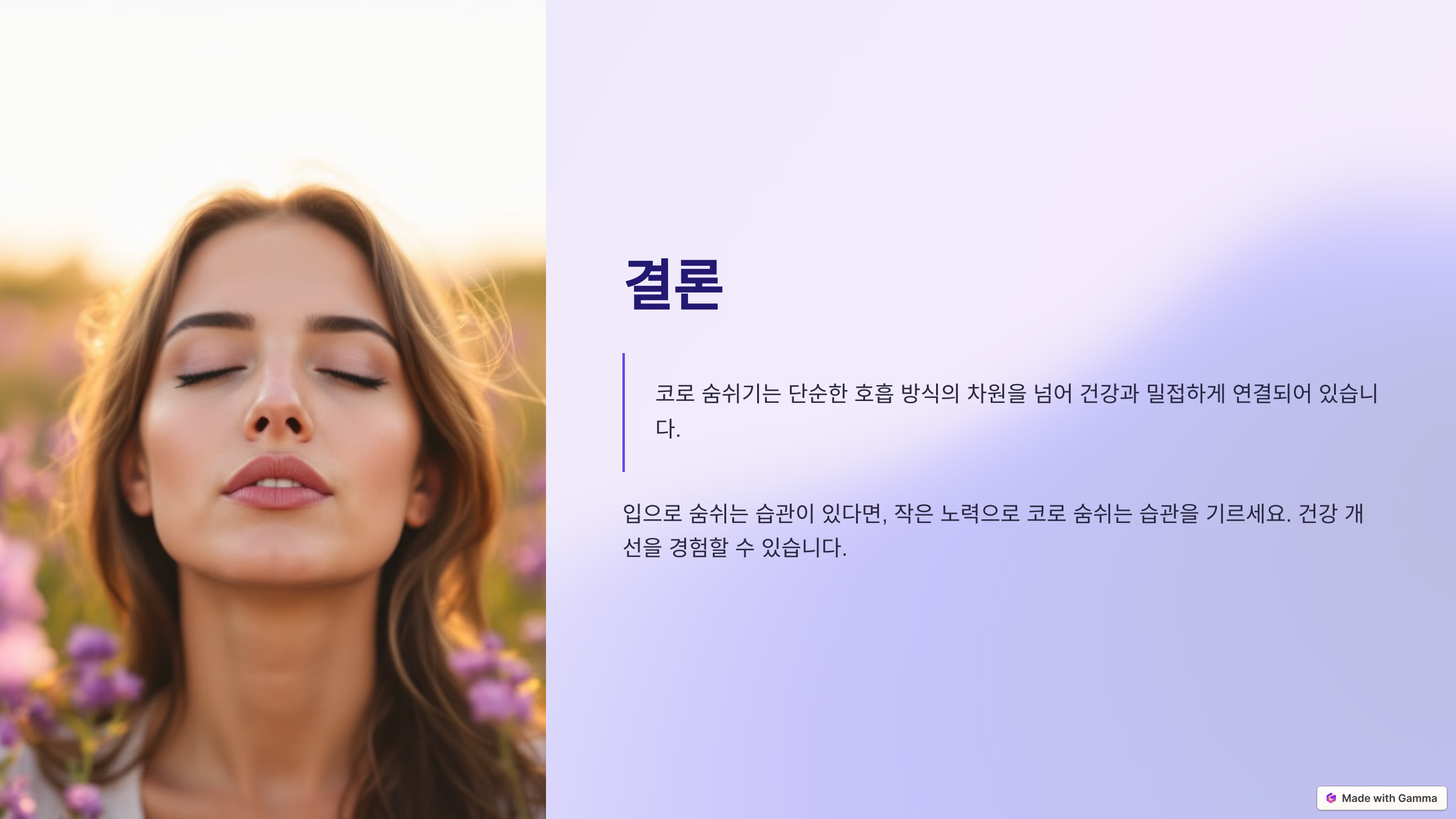 코로 숨쉬기는 단순한 호흡 방식의 차원을 넘어 건강과 밀접하게 연결되어 있습니다. 입으로 숨쉬는 습관이 있는 경우, 작은 노력을 통해 코로 숨쉬는 습관을 기르고, 건강을 개선해보세요.
