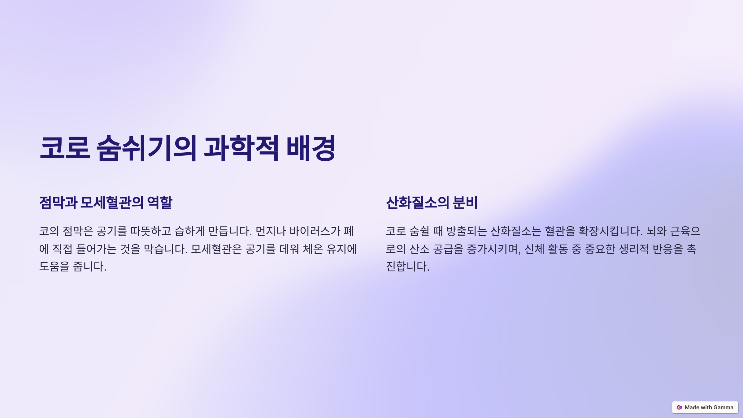 코로 숨을 쉴 때 방출되는 산화질소는 혈관을 확장시키는 데 중요한 역할을 합니다. 이는 뇌와 근육으로의 산소 공급을 증가시키며, 특히 신체 활동 중 중요한 생리적 반응을 촉진합니다.