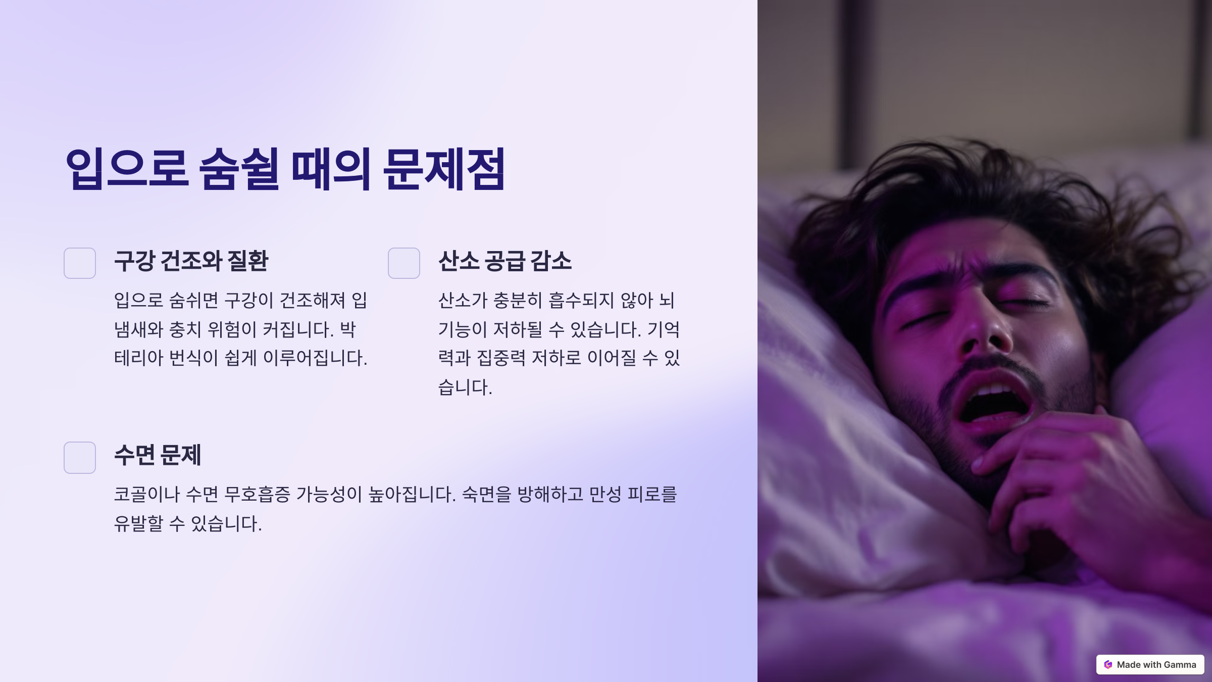 코가 아닌 입으로 숨을 쉬는 사람은 코골이나 수면 무호흡증과 같은 문제를 겪을 가능성이 높습니다. 이는 숙면을 방해하고, 만성 피로를 유발할 수 있습니다.