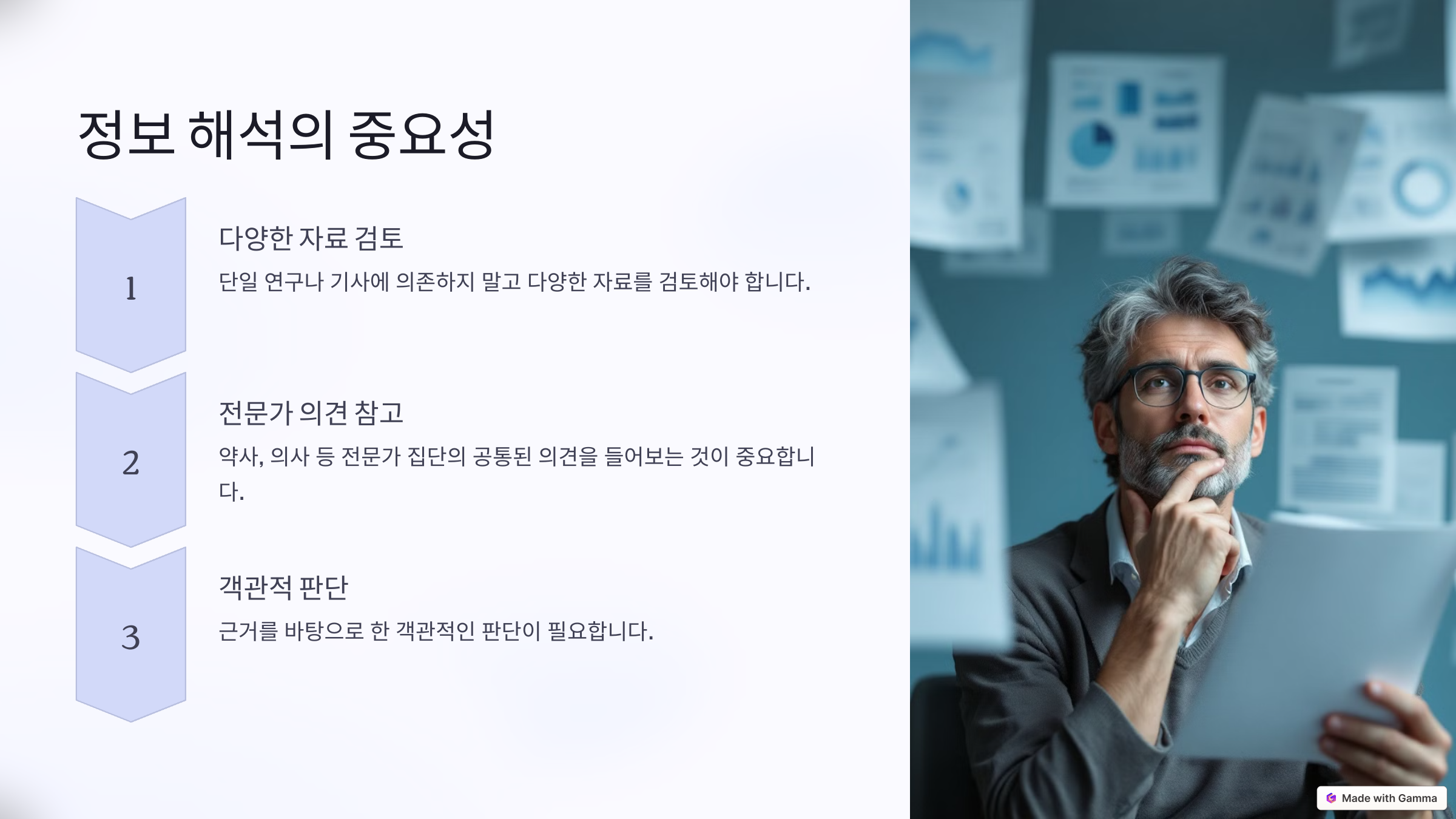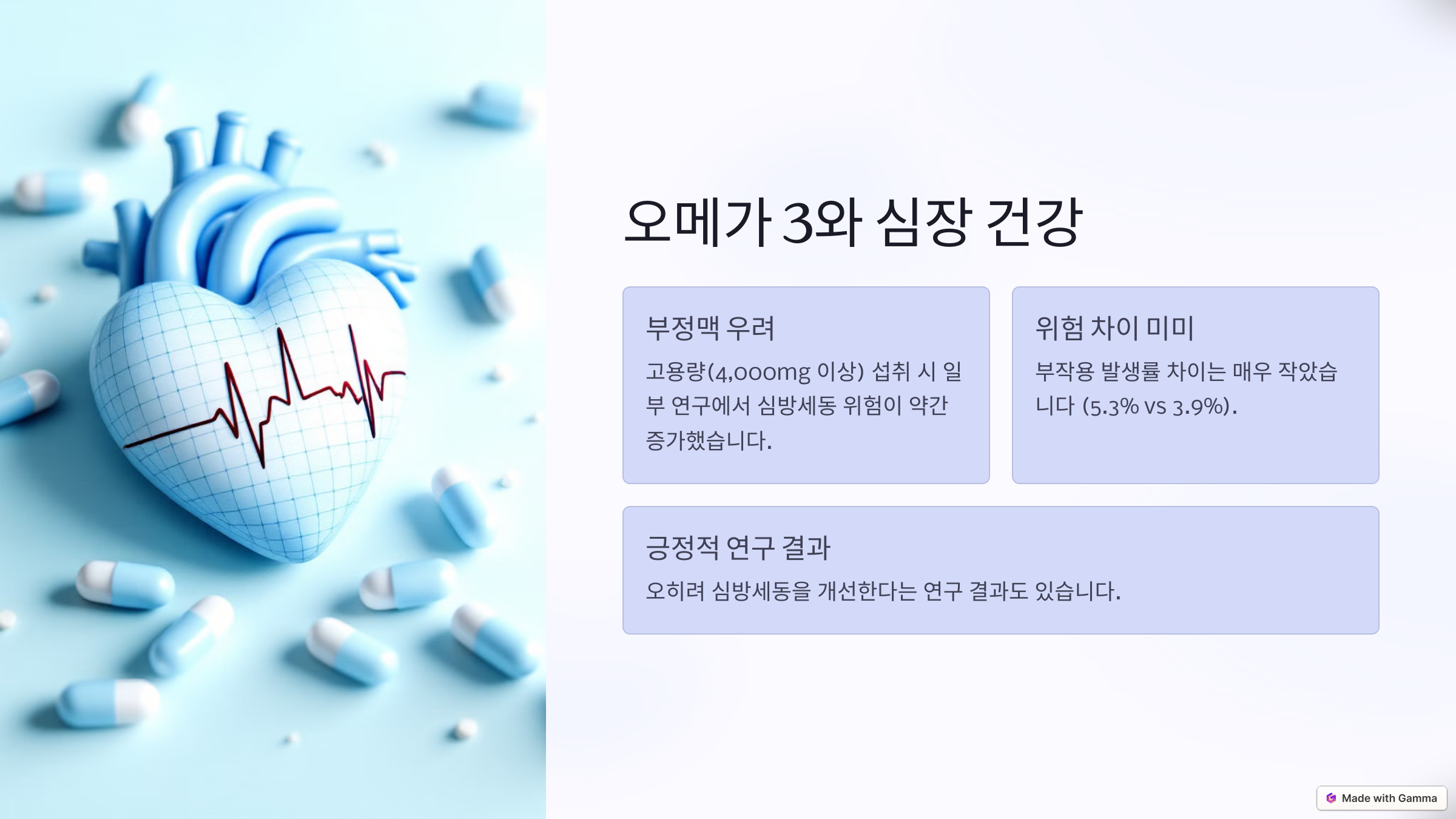그리고 올 초에 오메가 3를 먹으면 심장병이 생긴다 부정맥이 생긴다 이런 기사를 보셨을 겁니다. 그래서 식약처에서 난리가났다 이런 걸 보셨을 건데 이것도 결론적으로 오메가 3를 4,000mg 이상 먹었을 때 일부 데이터에서 신방 세동이 나타났다. 그래서 4,000mm 이상의 메가도스 주의해 달라라는 거였고 그 데이터에서도 4,000mm 이상 먹으면은 심방세동 부작용이 5.3% 안 먹으면 3.9% 있어요 거의 차이가 별로 없었습니다. 반대되는 연구는 오히려 심방세동 부정맥을 개선 시켜 준다는 논문도 있습니다. 따라서 여러 가지 자료를 검증을 해서 전문가들의 얘기를 듣고 판단하시면 되는 거지 하나의 기사 하나의 어떤 데이터 이러 것만 가지고 일희일비 할 필요가 없는 겁니다. 특히 언론사나 유사 전문가들 일반인들 나와서 이런 거만 보고 막 붙이는 분 그리고 극단적인 채식주의자들도 있거든요 그런 주장을 믿지 마시고 데이터를 기반으로 그 얘기를 할 때는 무조건 이런 근거 기반으로 얘기를 하는 겁니다.