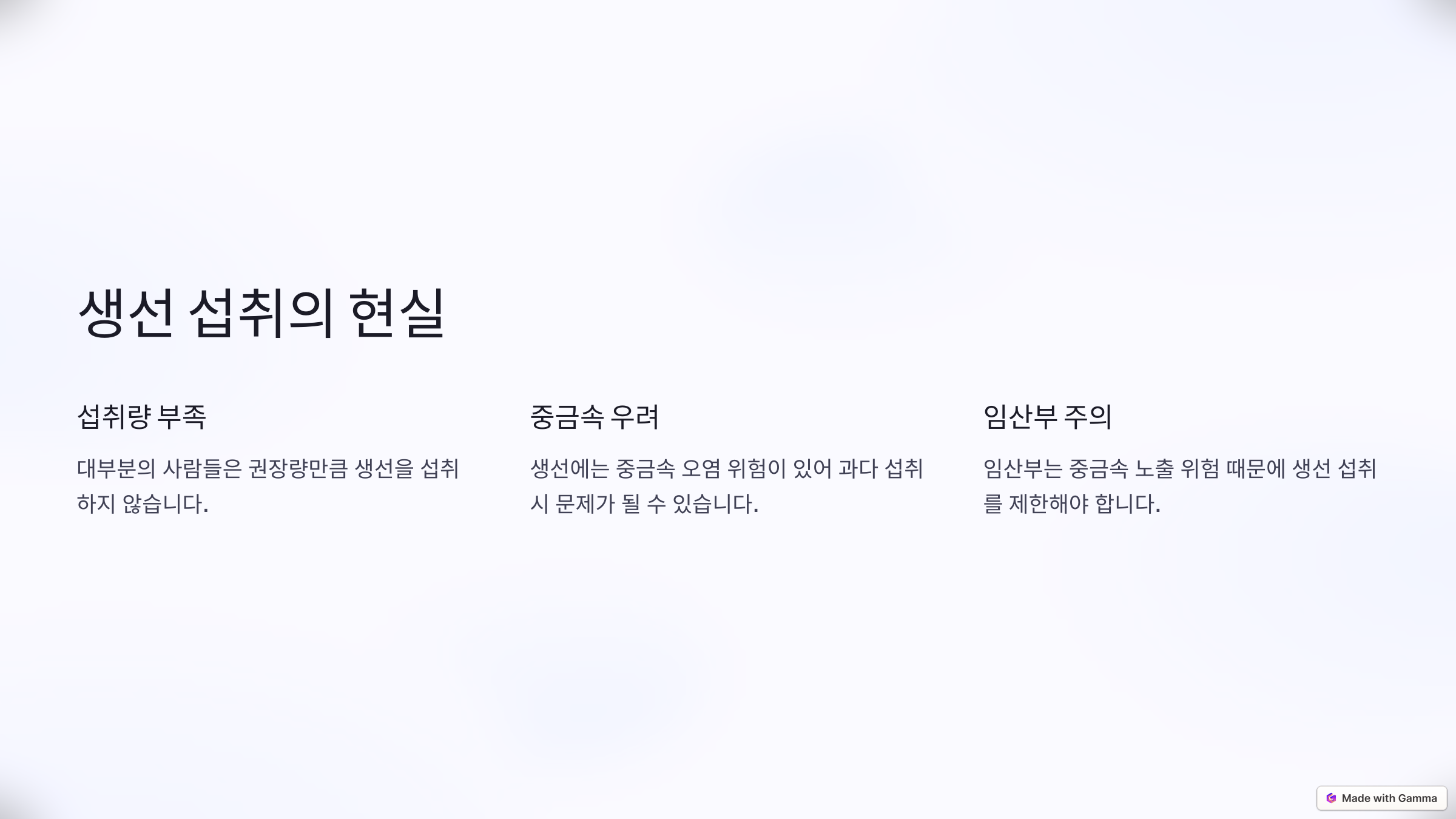 그런데 세 가지 측면을 좀 보셔야 됩니다. 생선을 먹을 때 주 2에 생선을 고등어 한 마리씩 드시는 분 계신가요? 그런 분들은 안 계실 거고 그리고 오메가 3 메가도스를 하기 위해서 오메가 3알 먹어야 되는데 그런 분들은 생선을 매일 먹어야 되고 그리고 생선에 중금속 오염이 심하죠 그래서 많이 먹다 보면 중금속에 누적됩니다.