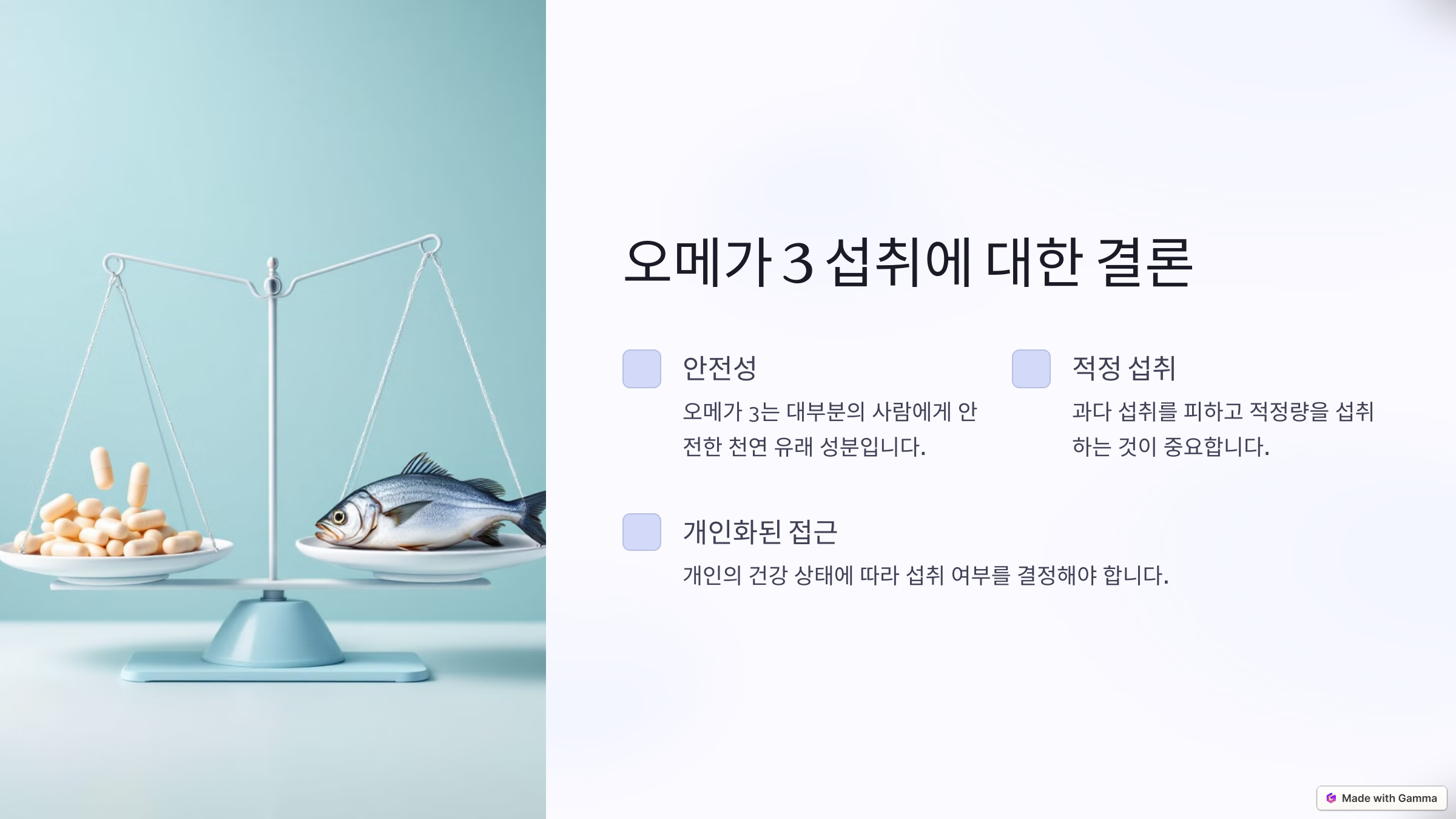 이런 말도 안 되는 얘기를 듣고 현혹 되실 필요가 없다는 겁니다. 약사들 의사들 그리고 전문가 집단들의 공통적인 의견들을 한번 들어 보시고 객관적인 판단을 스스로 하시면은 좋을 것 같습니다 영양제 성분은 의약품과 달리 조건을 통제하는게 대단히 어렵기 때문에 연구 결과가 다 달라지는 거기 때문에 너무 걱정하지 마시고 그 오메가 3 같은 경우는 천연에서 유래된 동물에서 유래한 성분이 아아 식물성 오메가 3는 조류에서 추출한 거고 이런 것들 생선을 짠 기름이 아아 그러니까 이런 것들은 보통은 우리 몸에서 큰 문제가 되지 않 않습니다.