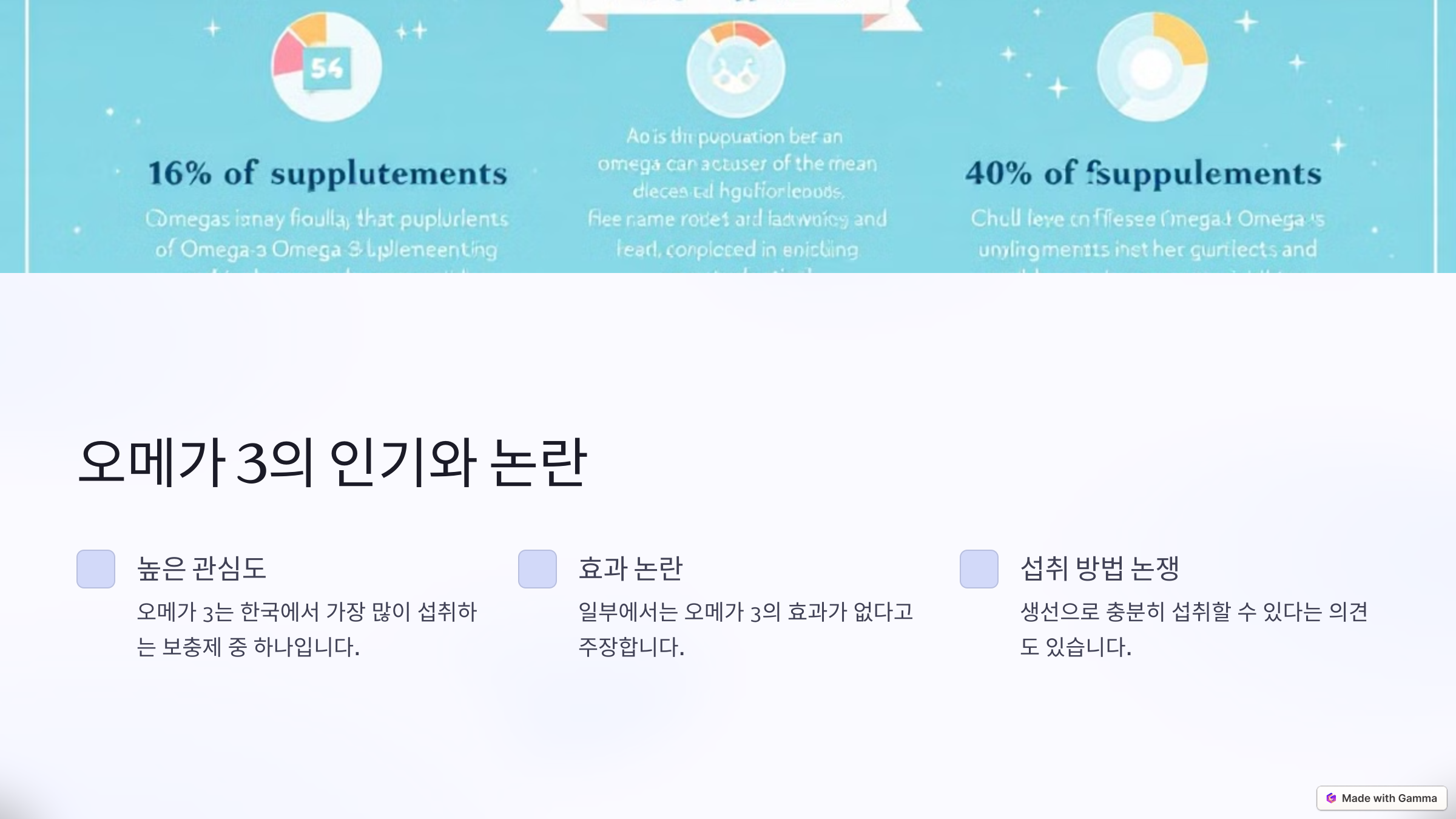 오메가 3가 왜 이렇게 말이 많을까요? 일단 오메가 3가 우리나라 사람들 가장 많이 섭취하는 보충제 5위 안에 들고 특히 영양제 고관여 하시는 건강에 관심 많으신 분들이 오메가 3를 다 드시고 있고 병원에서 처방을 다 하고 있기 때문에 관련해서 관심도가 높죠 그런데 거기에서 먹지 마 의미 없어 효과 없어 먹으면 큰일 나 이런 식으로 얘기하면은 집중도가 확 올라가죠. 오메가 3는 생선으로 충분히 먹을 수 있는데 왜 먹냐? 맞는 말 말이긴 합니다.