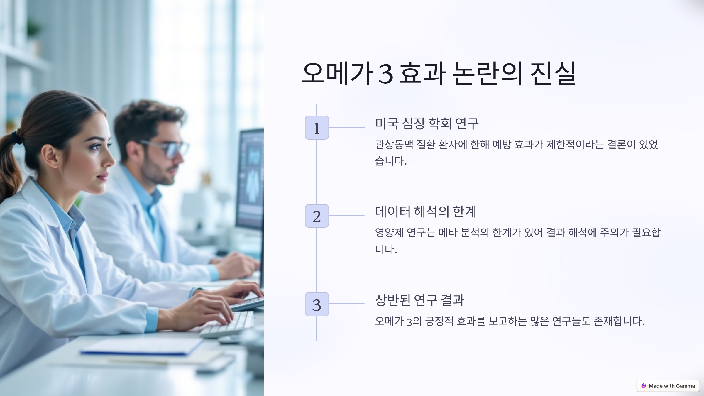 그런데 결론이 오메가3 퇴출된다는 거는 사실과 다르고 미국 심장 학회와 심장 협회에서 관상동맥 질환 환자에게 오메가3를 사용하는게 심혈관 질환을 예방하는데 큰 도움이 안 된다라고 결론을 내린 겁니다.
