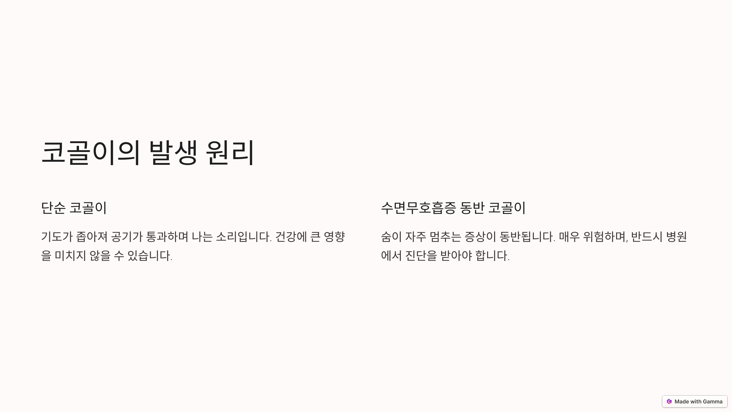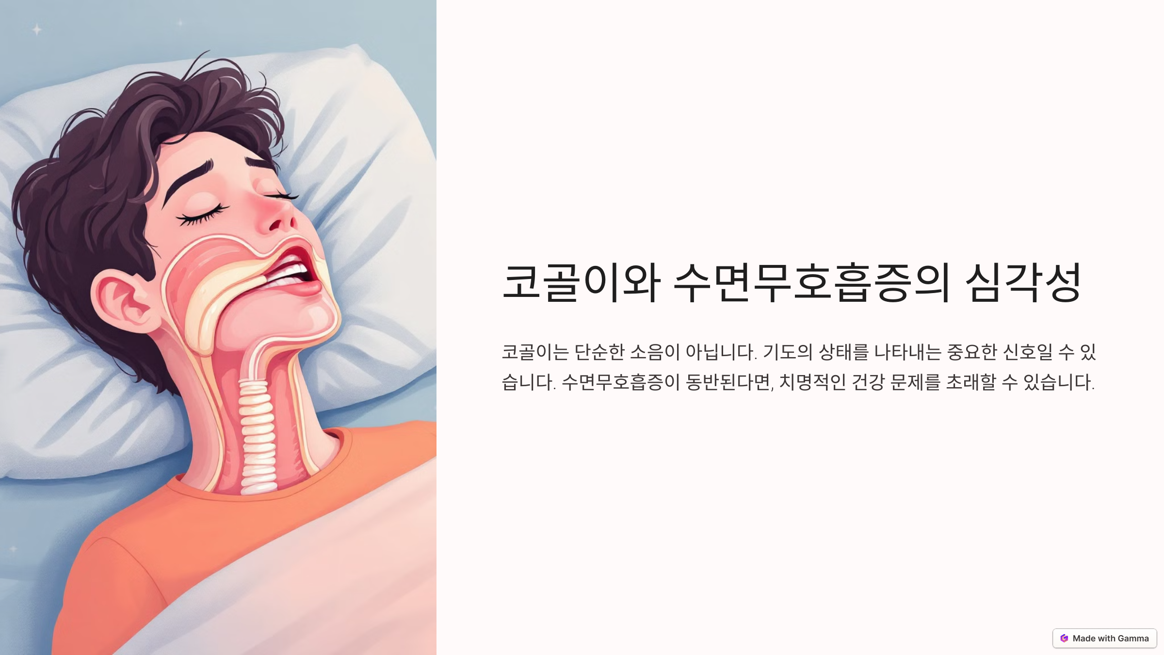 많은 사람들이 코골이를 단순한 소음 문제로 여기는 경우가 많습니다. 하지만 코골이는 단순히 수면 중 발생하는 진동 소리가 아니라, 기도의 상태를 나타내는 중요한 신호일 수 있습니다. 특히 수면무호흡증이 동반된다면, 이는 치명적인 건강 문제를 초래할 수 있습니다.