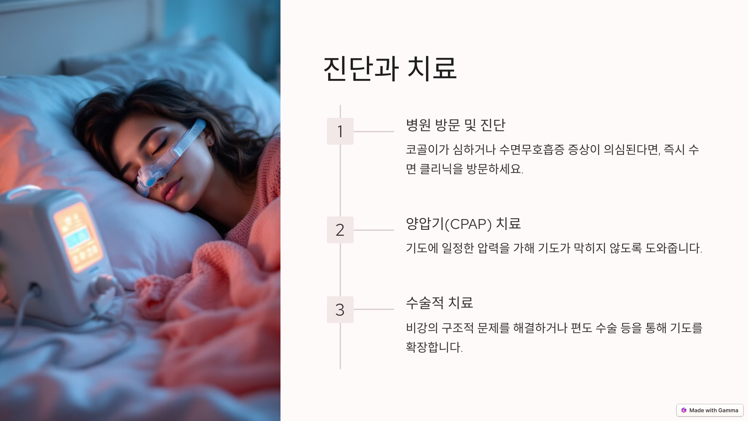 코골이는 단순한 수면의 불편함으로 그치지 않고, 심각한 건강 문제의 신호일 수 있습니다. 가족의 건강과 자신의 건강을 지키기 위해, 조기에 진단받고 적절한 치료를 시작하세요.