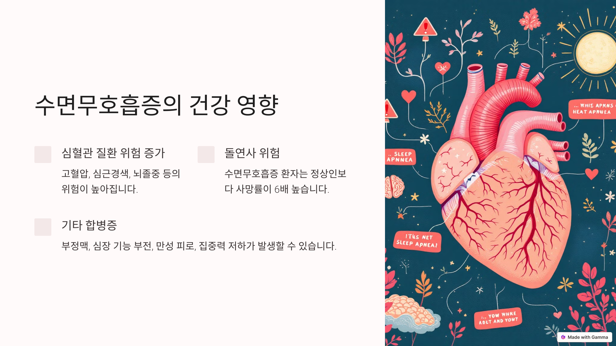 수면무호흡증은 고혈압, 심근경색, 뇌졸중 등의 심혈관계 질환과 강한 연관이 있습니다. 이는 기도가 막히면서 산소 공급이 줄어들어 심장과 뇌에 부담이 가기 때문입니다.