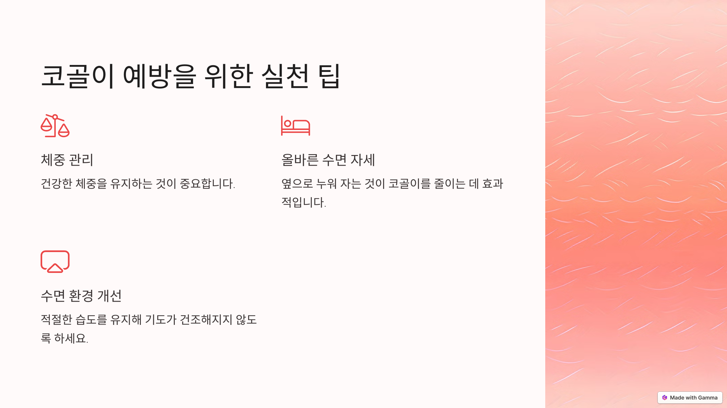 생활습관 교정: 체중 감량, 금연, 금주 등이 코골이와 수면무호흡증 개선에 효과적입니다.
