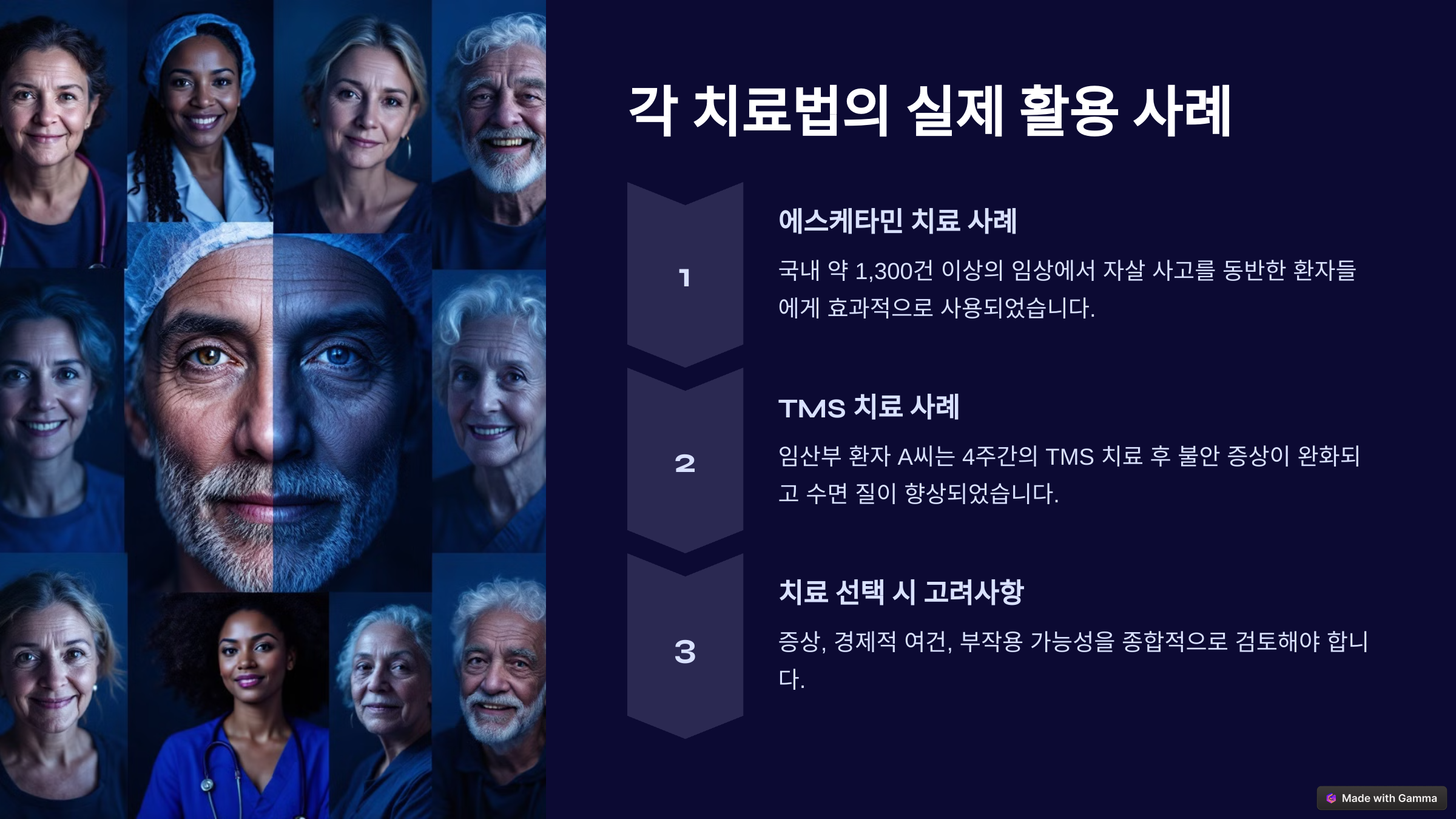 국내 약 1,300건 이상의 임상에서 자살 사고를 동반한 환자들에게 효과적으로 사용되었습니다. 한 환자는 기존 항우울제에 반응하지 않았으나, 에스케타민 치료 후 1시간 이내에 자살 사고가 현저히 감소하였습니다.