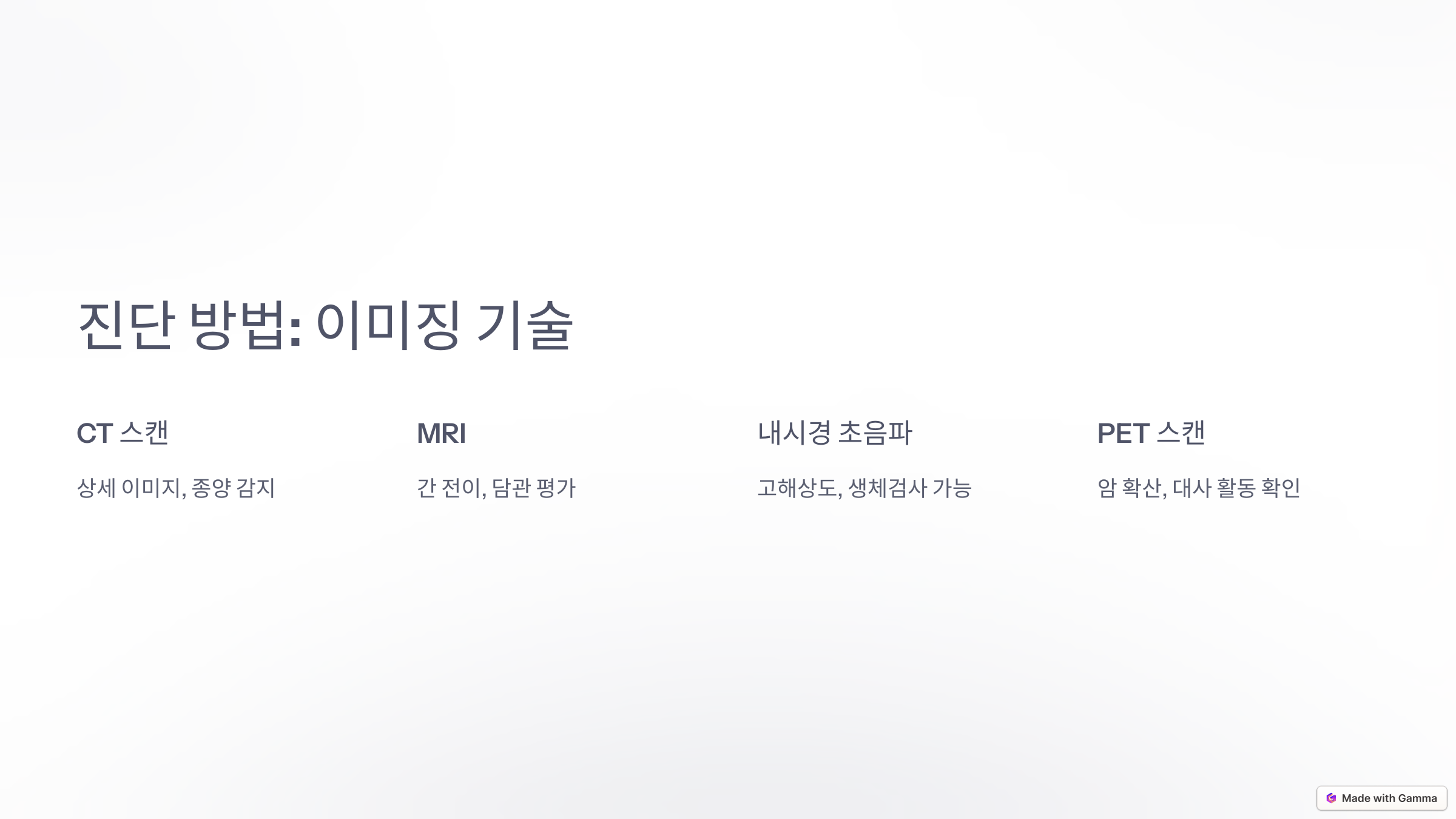 MRI(자기공명영상): 간 전이를 식별하고 담관 및 췌장관을 평가하는 데 특히 유용합니다.