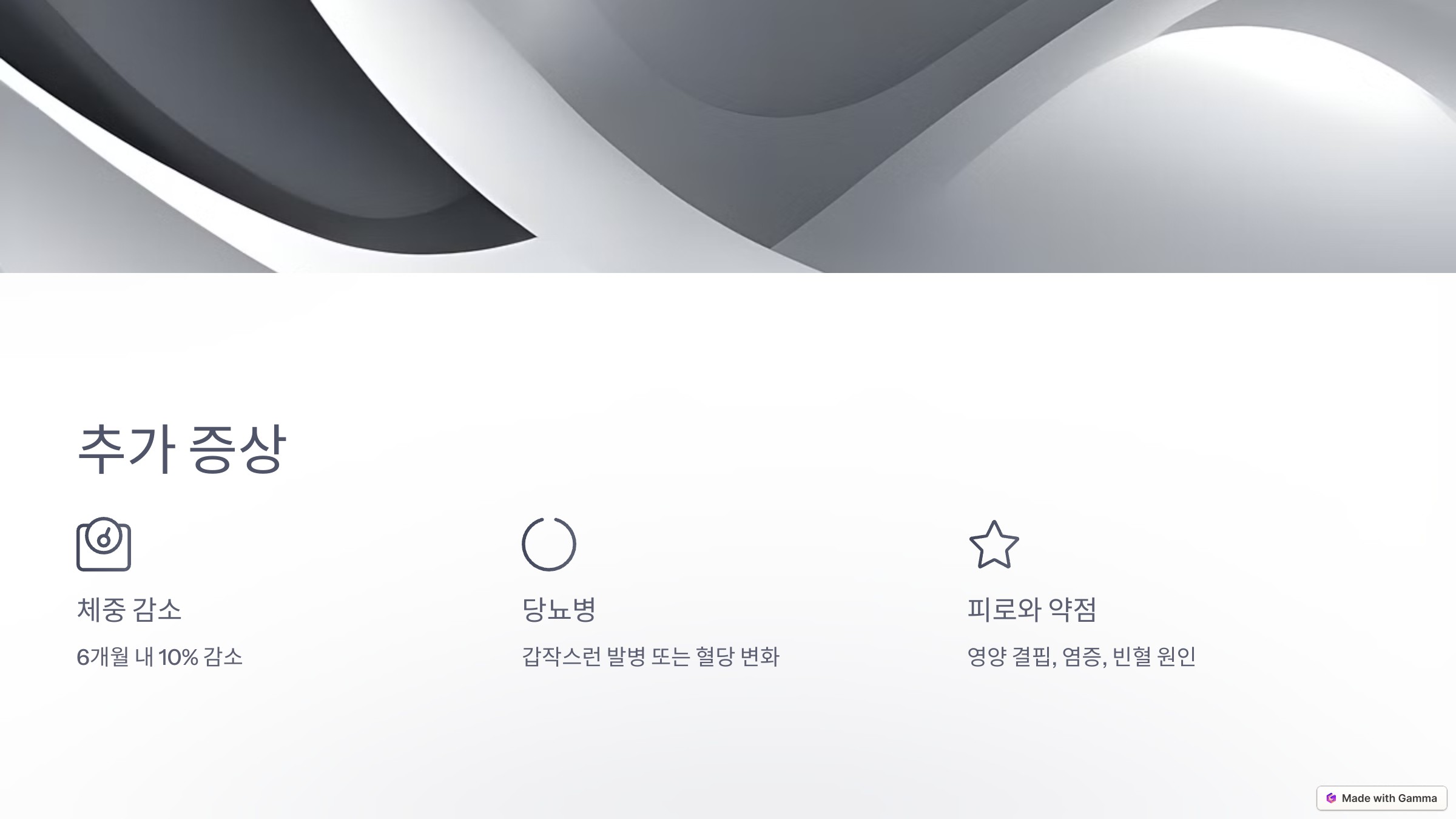 빠르고 의도하지 않은 체중 감소(예: 6개월 이내에 체중의 10%)는 암, 특히 췌장암의 특징적인 증상입니다. 이는 종양의 대사 요구와 소화 장애로 인해 발생합니다.