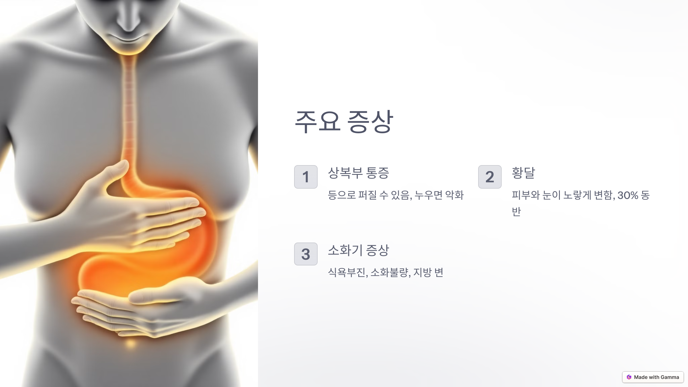 관련 증상: 황달과 함께 어두운 소변, 창백한 변, 가려움증이 나타나는 경우가 많습니다.