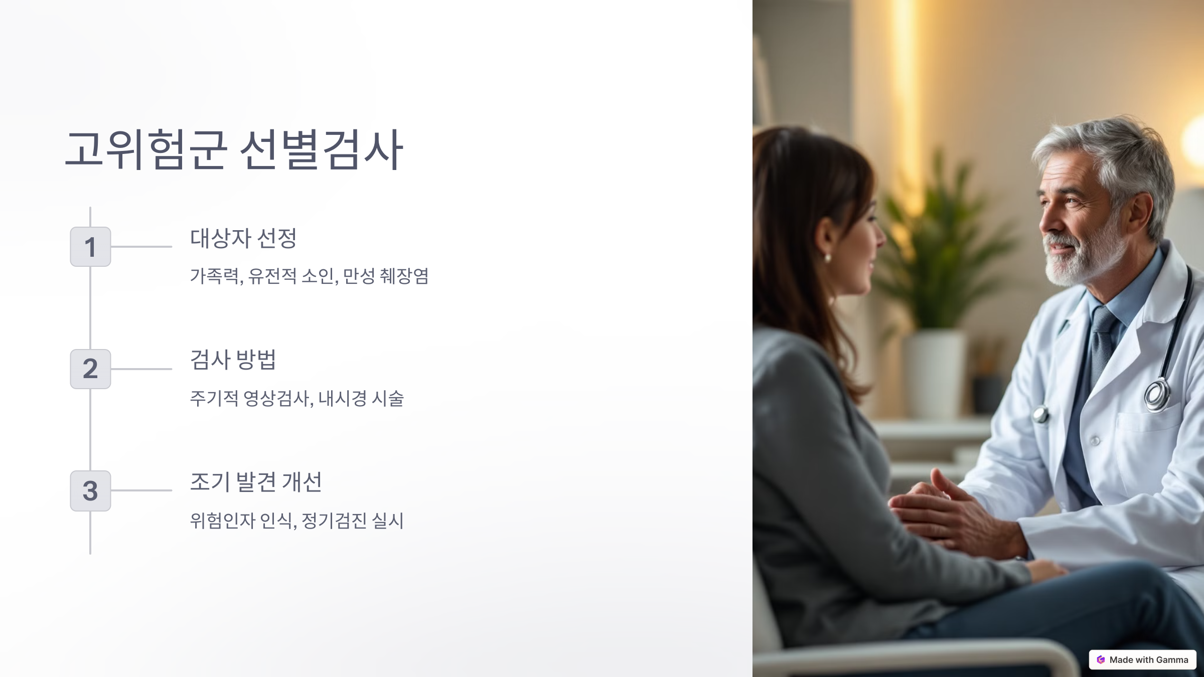 기법: 고위험군에는 주기적인 영상검사와 내시경 시술이 권장됩니다.